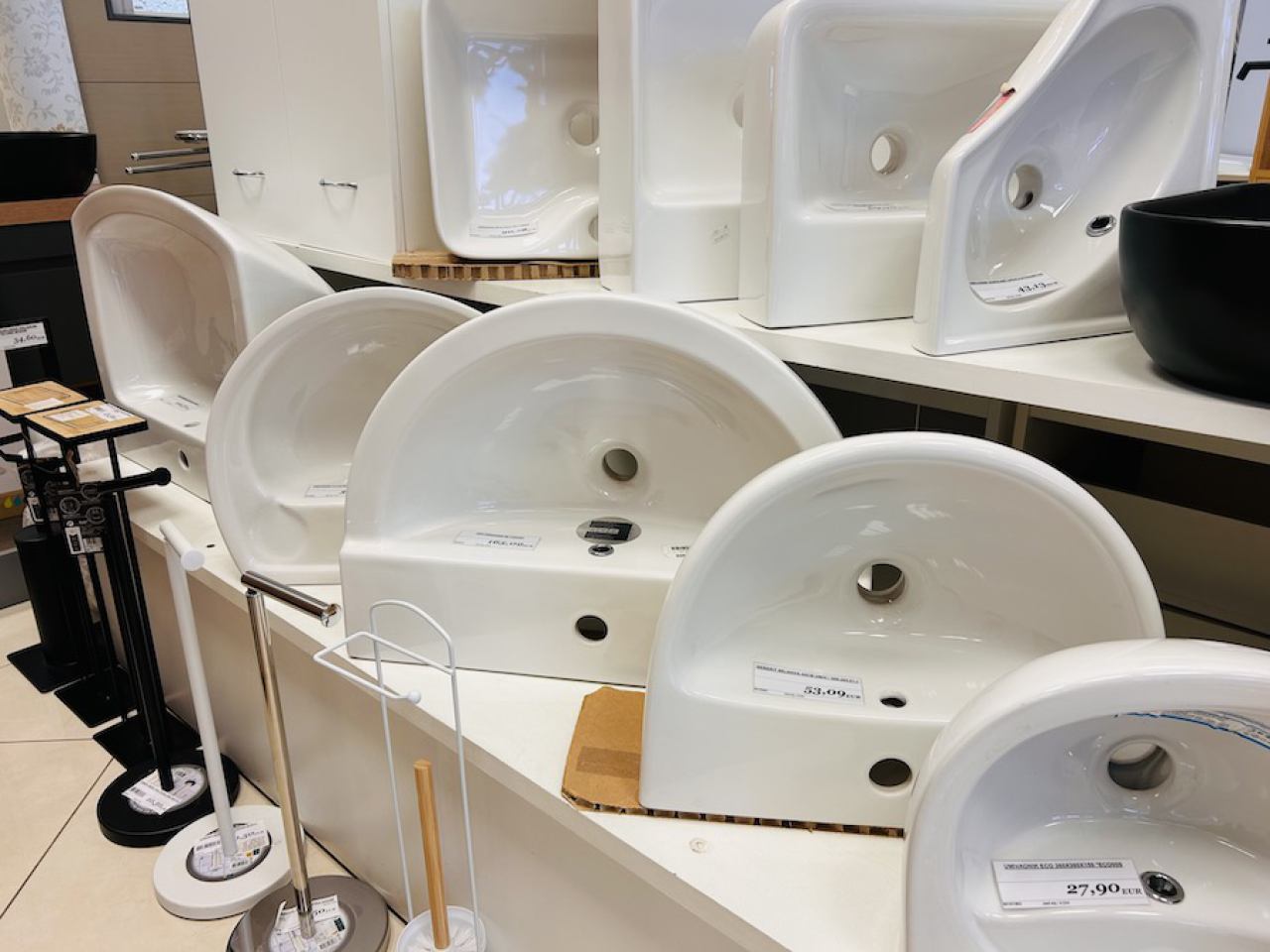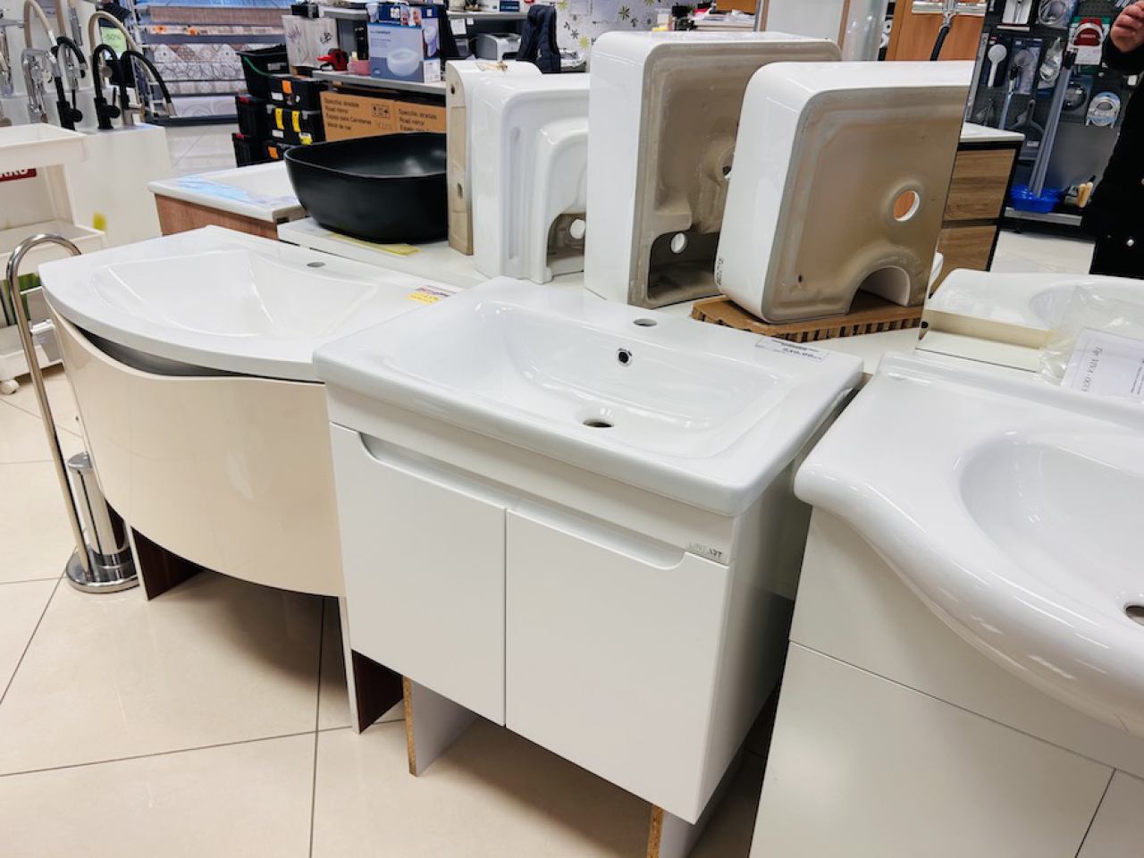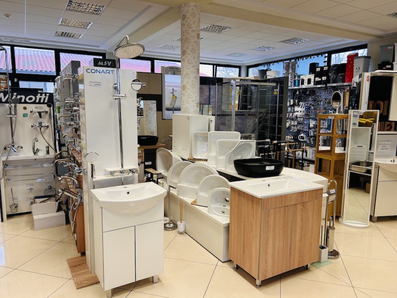 Ponudu upotpunjuje bogat izbor sanitarija: umivaonici, WC-školjke, tuš kabine, baterije renomiranih marki. Dostupan je i kupaonski namještaj: ormarići, ogledala, stalci, police i dodatci.