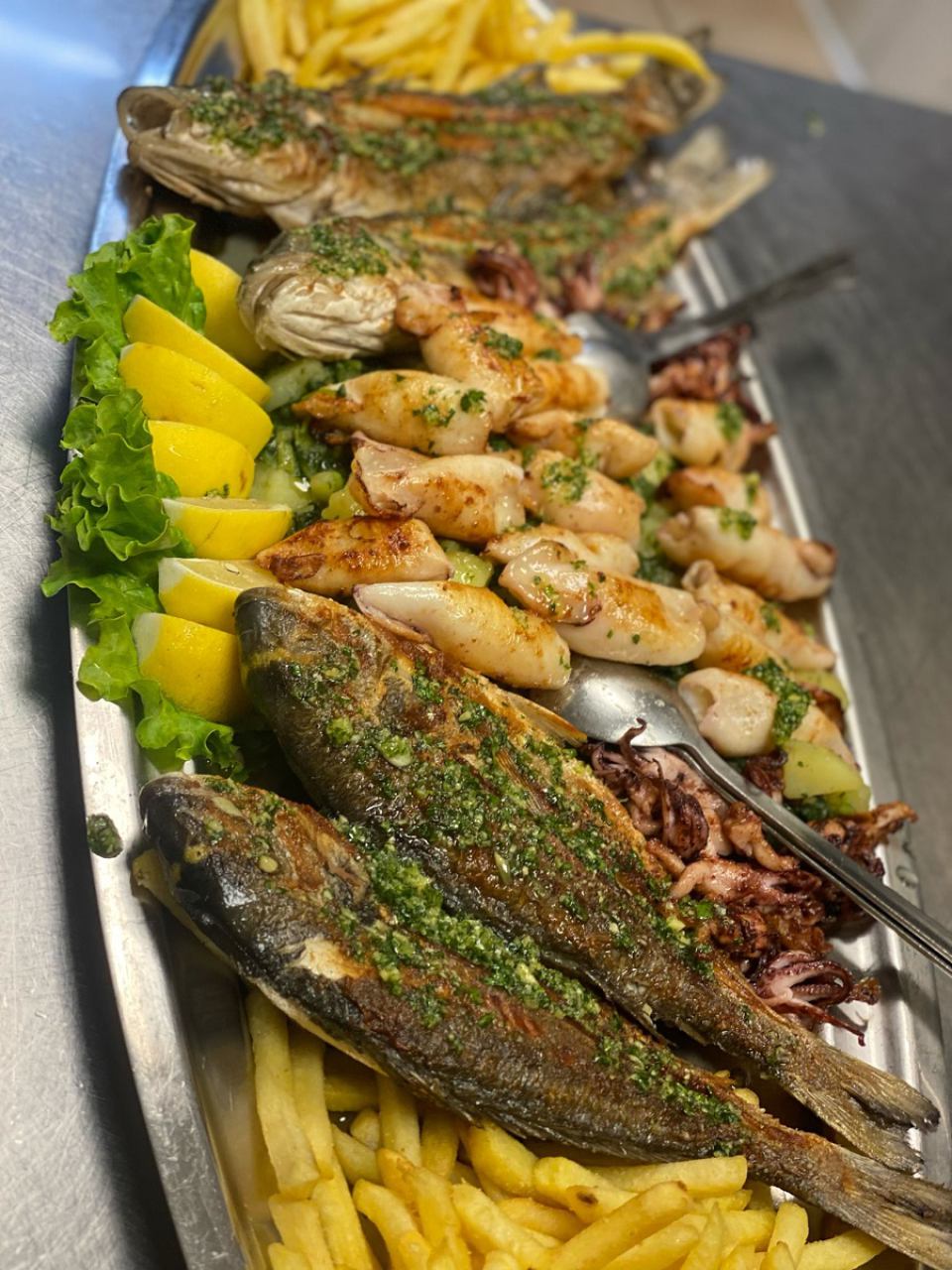 Die Speisekarte bietet eine Vielzahl von Fischspezialitäten, darunter Seebarsch, Hummer, Brassen, gegrillte und buzara Garnelen, Thunfischsteak, Seezunge und Tintenfisch.