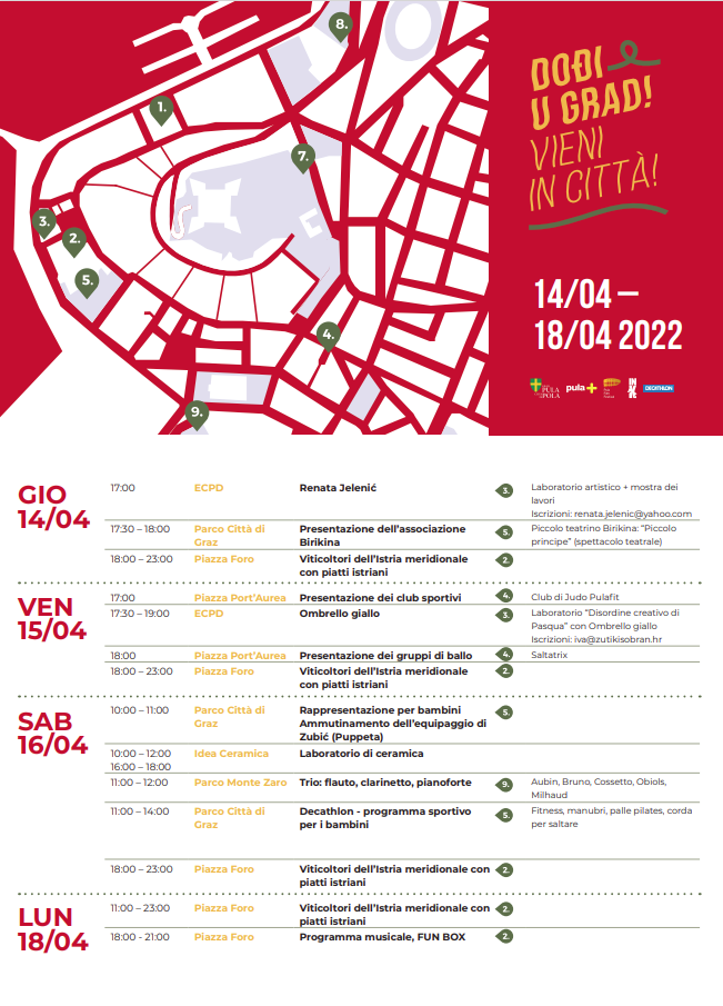 U petak u 17 sati na Portarati će se predstaviti sportski Judo klub Pulafit, a sat kasnije trg će zauzeti plesači i plesačice plesnog studija Saltatrix. Najmlađima je namijenjena radionice „Uskršnji kreativni nered" koja će se održati u ECPD-u od 17:30 sati u organizacije Udruge žuti kišobran, a prijave se zaprimaju putem e-pošte iva@zutikisobran.hr.